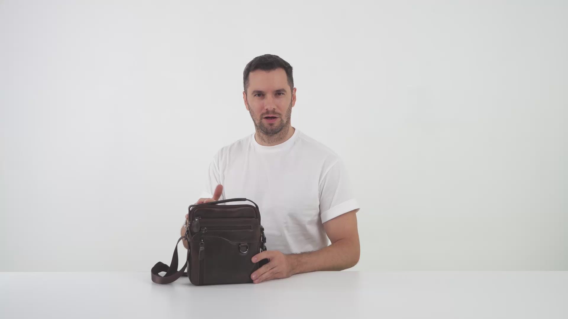 Este realizata din piele naturala, beneficiaza de doua compartimente principale si patru buzunare mai mici, toate exterioare. Se poarta cu ajutorul unei curele ajustabile sau in mana de maner. Este simpla si incapatoare, chiar daca nu este de o dimensiune foarte mare, ai unde sa-ti asezi lucrurile. Se poate adauga oricarei tinute, deci indiferent de look-ul ales astazi, borseta se va potrivi cu siguranta.